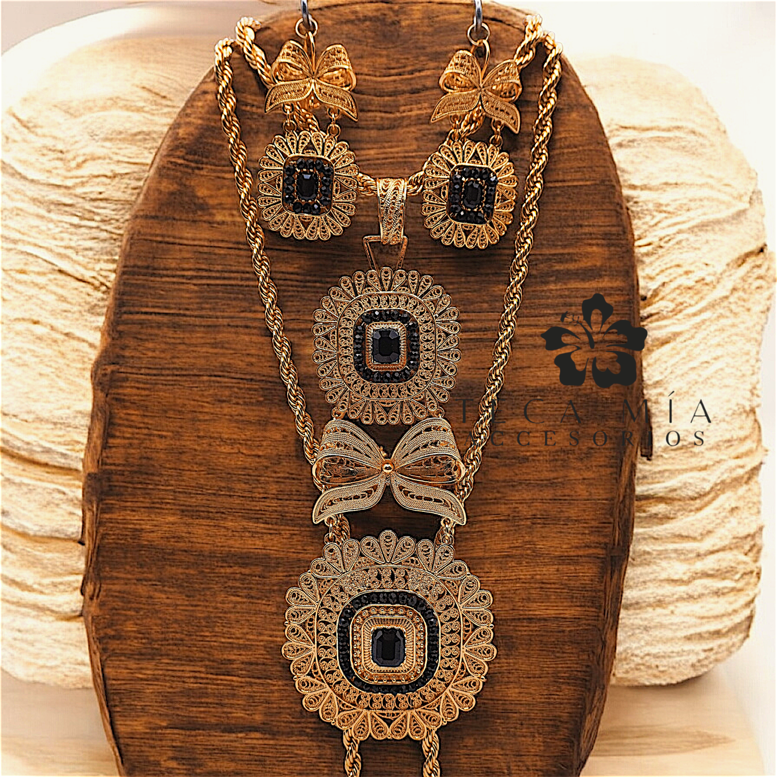 Luce sofisticada con este set único que incluye ahogador largo y ahogador corto, aretes,